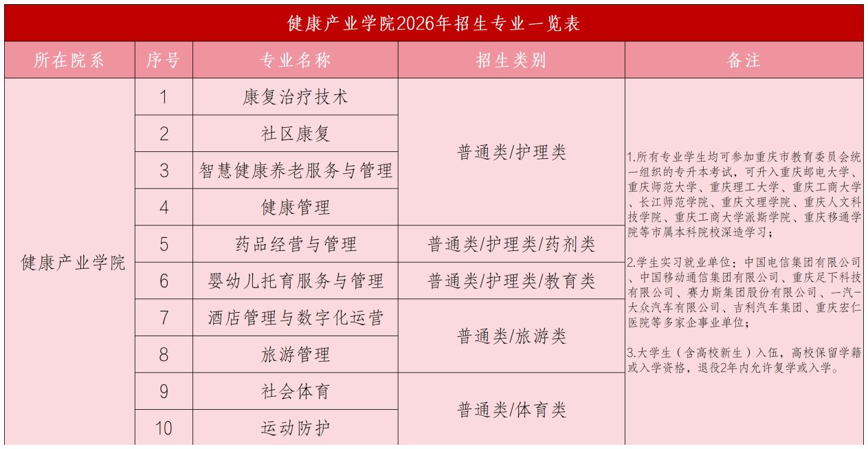 健康产业学院积极响应“健康中国2030”战略,聚焦全生命周期健康服务需求,构建了“教学创新—技能培养—社会服务”三位一体的人才培养体系。学院设有康复治疗技术、社区康复、智慧健康养老服务与管理、药品经营与管理、婴幼儿托育服务与管理、健康管理、社会体育、运动防护、旅游管理、酒店管理与数字化运营等10个专业,形成了覆盖康复、养老、育幼、健康促进等多领域协同发展的专业集群。