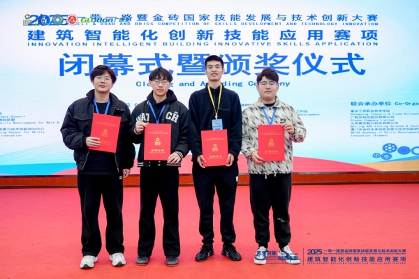 2025年11月21日至23日,2025一带一路暨金砖国家技能发展与技术创新大赛建筑智能化创新技能应用赛项全国总决赛在重庆工贸职业技术学院圆满落幕。学校智慧城市与交通学院学子不负众望,由建筑工程技术专业蒋志远、肖宇浩、钟梓铭3位同学组成的代表队,在宋玉华、黎彬两位老师的精心指导下,凭借扎实的专业功底、创新的技术应用和稳定的赛场发挥,成功斩获智慧设计与人工智能物联网方向全国一等奖,同时学校还荣获“最佳组织奖”,指导教师宋玉华、黎彬获评“优秀指导教师奖”,实现竞赛成绩与荣誉表彰的多重突破!