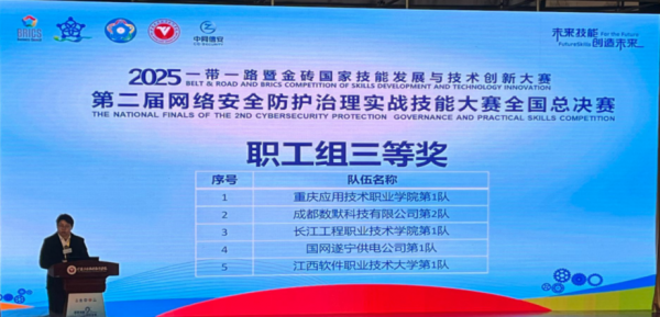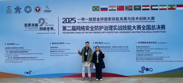 2025年12月15日在四川省广汉市中国民用航空飞行学院(广汉校区)举行“2025年一带一路暨金砖国家技能发展与技术创新大赛—网络安全防护治理实战技能赛项全国总决赛,互联网信息学院徐凰耀和徐黎老师,与来自全国140余支优秀队伍(其中职工组25支)参加决赛,凭借扎实的专业功底、默契的团队协作与沉稳的临场应变能力,排名职工组第9,荣获三等奖。(供稿:互联网信息学院/刘天英)
