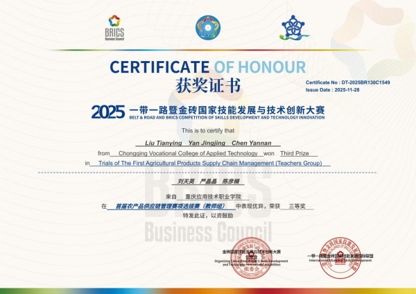 赛事概况:首届农产品供应链管理赛项(教师组)经过层层选拔,来自全国各地的53支精英教师队伍成功晋级全国总决赛。2025年12月11日,通过在线汇报展示方式举行该项赛总决赛,互联网信息学院刘天英,严晶晶,陈彦楠三位教师积极筹备,以饱满的热情和扎实的专业功底投入比赛,最终荣获三等奖。