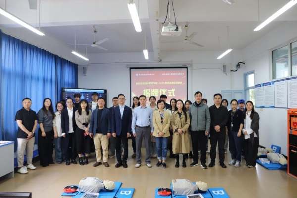 2026年4月15日,健康产业学院AHA急救实训培训基地在1228实训室举行揭牌仪式。重庆沛德行健康科技有限公司总经理莫大瑞,党委书记何菲,以及相关职能部门负责人,各二级学院负责人,师生代表参加活动。