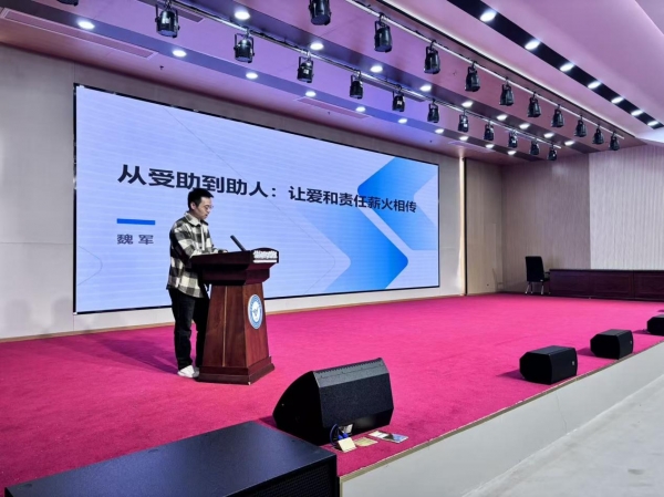 魏军校友的分享中,穿插着他带领团队开展助学活动的照片、受助学子的感谢信,让在场学子直观感受到“善举接力”的力量,现场掌声此起彼伏。学生处处长在总结时表示,魏军校友用“受助 - 感恩 - 助人”的轨迹,生动诠释了“暖意相承”的内涵,他的经历是国家资助育人成效的鲜活证明,也为学子树立了可学可做的榜样。希望全体学子以他为镜,从身边小事做起,让善意在校园与社会中流转。